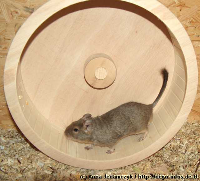 Degus laufen gern einfach mal los, von daher sollte ein Laufrad angeboten werden. Laufräder ersetzen aber keinen großen und abwechslungsreich eingerichteten Käfig, sie sind nur ein Zusatzangebot! Die meisten im Handel erhältlichen Laufräder stellen eine große Gefahrenquelle dar: