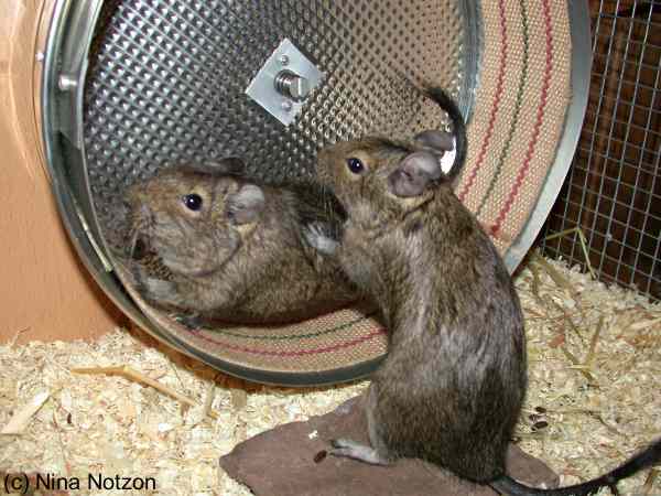 - Oft laufen Degus auch zu schnell im Laufrad, dabei kann es dazu kommen, dass sie sich überschlagen oder über die eigenen Füßchen stolpern, dass es dabei zu Verletzungen kommen kann, ist leider nur zu oft bestätigt worden. Mitunter behindern Degus sich gegenseitig beim Laufen im Rad, was ebenfalls zu Verletzungen und Stürzen führen kann.