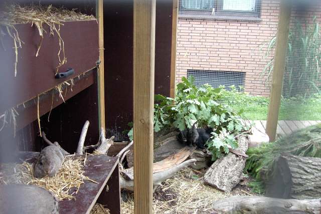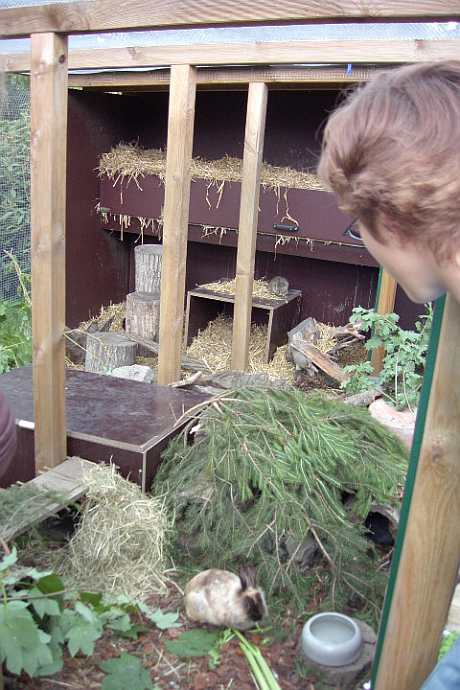 Zusätzlich zur Hütte sollte das Gehege noch sehr viele Versteckmöglichkeiten und Naturalien beinhalten. Einen ausgehölten Baumstamm oder eine Korkröhre kann ich nur empfehlen. Andere Baumstümpfe, Wurzeln , Äste und Zweige zum Klettern, Beknabbern, Verstecken und Draufspingen dürfen aber auch nicht vergessen werden und sind sehr wichtig für eine gute Struktur im Geheges und damit für das Wohlbefinden unserer Kaninchen. Auch Tannenzweige bieten z.B. eine schmackhafte Abwechslung wie auch eine ideale Rückzuggelegenheit zum Ausruhen der Tiere und sollten - genau wie andere frische Zweige und Blätter - möglichst nie fehlen. Auch mit Hilfe von Steinen, Blumentöpfen und Brettern kann man das Gehege kaninchengerechter gestalten. Wichtig ist nur, dass man den Lebensraum seiner Kaninchen regelmäßig verändert und Altes durch Neues ersetzt, um so für Abwechslung zu sorgen, denn sonst wird es den Tieren bald langweilig. Etagen an der Rückwand oder andere höher gelegene Plattformen werden gern als Aussichtspunkt genutzt.
