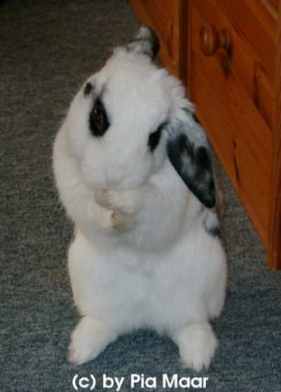 Auf den Hinterpfoten aufrichten/Männchen machen: Kaninchen richten sich auf um so einen besseren Überblick über ihre Umgebung zu haben. Kaninchen in der Heimtierhaltung richten sich auch auf, um höher gelegene Dinge besser sehen zu können und ihre Umgebung neugierig zu erforschen, um auf sich aufmerksam zu machen oder anzuzeigen, dass Sie ihm eine Tür öffnen sollen. Kaninchen machen auch Männchen um zu betteln, sie recken sich ihrem Halter entgegen, schauen herzallerliebst, schnüffeln, schubsen und bedrängen ihren Halter. Der Halter sollte diesem Betteln nicht zu oft nachgeben, aber hin und wieder darf natürlich ein Männchen machen gern mit einer Möhre oder andrem Gemüse belohnt werden.