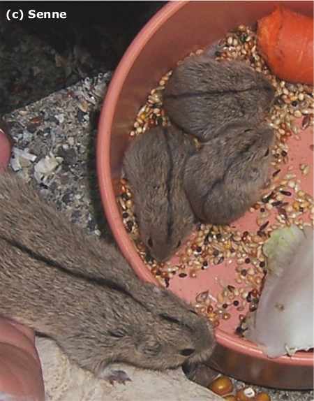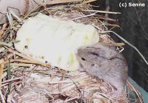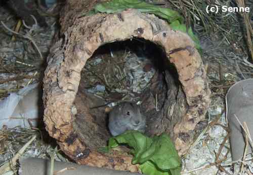 Dieses Terrarium hat die Maße: Länge 200 x Breite 40 x Höhe 40 cm. Die Einstreu ist ein Gemisch aus Sand, Torf, Hanfstreu, Kleintiereinstreu, Stroh und Heu und ist zwischen 10 und 20 cm hoch. Auf der mit Wurzeln und Äste abgetrennten Futterseite ist etwas weniger Einstreu (Sand), damit die Futterschalen nicht zugebuddelt werden und Frischfutter sauber angeboten werden kann. Als weitere Einrichtung gibt es viele Zweige, Korktunnel, Toilettenpapierrollen, Wurzeln, Heunester und andere Klettermöglichkeiten. In diesem Terrarium wohnt ein Lemmingpärchen zusammen mit seinem Nachwuchs. Das Pärchen wohnt dauerhaft zusammen und hat regelmäßig Nachwuchs.