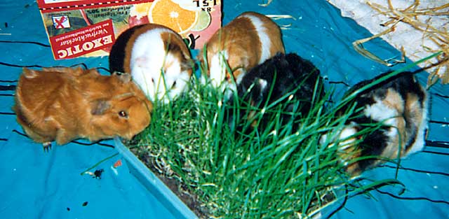 Es ist natürlich auch möglich eigenen Graswiesen Zuhause auf der Fensterbank zu ziehen. Benötigt werden dafür nur ungedüngte Blumenerde, ein Blumenkasten und eine gute Grassamenmischung, notfalls tut es auch Katzengras. Die Grassamen werden einfach auf die Erde gestreut und angefeuchtet. Gut feucht gehalten wächst dort innerhalb von 2 - 3 Wochen eine kleine Wiese. Es ist ebenso möglich, verschiedene Getreidesorten auszusähen, leider keimen allerdings viele Getreidearten, die im Supermarkt erhältlich sind häufig nicht mehr aus. Grundsätzlich dürfen alle Kleintiere das frische Grün aller Getreidesorten fressen. Die kleine Wiese darf aber nur dann ins Gehege gestellt werden, wenn der Boden/die Erde wirklich ungedüngt ist. Leider ist so eine ungedüngte Erde schwer zu bekommen, enthält der Boden aber zu viel Dünger, enthalten auch die Pflanzen zu viele Nährstoffe, außerdem sind einige chemische Düngemittel schlicht schädlich. Naturtorf ist ungedüngt, da aber beim Torfabbau Moore zerstört werden und Torf ohnehin recht sauer ist, sollte Torf nur in Ausnahmefällen verwendet werden. Eine Alternative wäre der Anbau ganz ohne Erde, wie das geht ist hier beschrieben: Weizengras selbst ziehen.