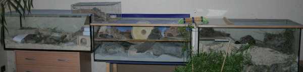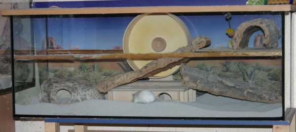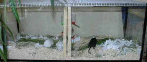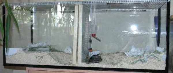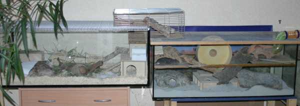 Also beschloss ich am Abend, beide in ihr Aquarium zu setzen - und wieder ging ich nicht nach Lehrbuch vor. Da beide Renner wirklich keinerlei Ansatz auch nur vom Markieren oder von Rangordnungskämpfen gezeigt haben, sondern sich Alpha ohnehin sofort waschsüchtig unterworfen hat und auch Persil keinerlei Ambitionen zeigte, irgendwas auszufechten, habe ich sie gleich in ein 100 x 40 cm Aquarium gesetzt. Dieses war nur eingerichtet mit ihrer vorab gebrauchten Streu, Nistmaterial, gefüllte Toilettenpapierrollen, Sandbad und einem aufrecht stehendem Gitter mit Wasserflasche und Frischfutterspieß.
