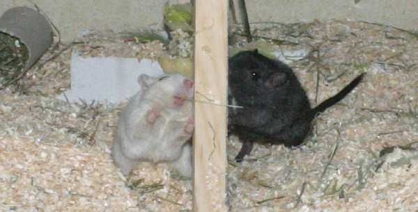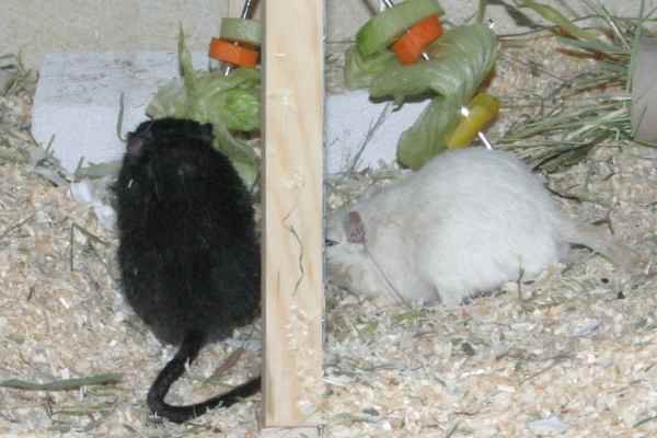 Beide haben die Nacht wie immer zusammen im Nest verbracht. Aber der Alpha findet das nicht wirklich gut, denn es ist das Nest von Persil und das ist vorne offen in der hellen Käfigecke ... weil Persil darauf besteht dort zu wohnen. Alpha hat aber doch nun sooooo tolle Tunnel gebuddelt und ein Nest unter der Brücke angelegt - Persil sieht das aber nicht als Nest an.... Na ob die sich da noch mal streiten? Bisher gibt Alpha seine Nester sofort auf, wenn er sieht, das Persil doch in seinem Nest schlafen will und er kuschelt sich dann zu Persi. Kuscheln ist also wichtiger als ein sicheres Nest, das dort ist, wo es Alphas Ansicht nach hingehört. Völlig friedlich einigen sie sich am Futterspieß, Futterneid scheint es für beide nicht zu geben. Auch wenn neue Einstreu und Knabberäste ins Gehege fliegen, wissen beide, was sie zu tun haben, Persil zernagt die Äste und Alpha kümmert sich um die Einstreu und das Gänge bauen. Langsam ist es mir fast unheimlich, wie einig sich beide sind, ich befürchte, der große Knall muss irgendwann kommen?!