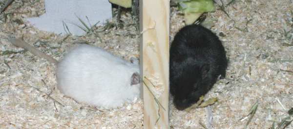 Erstmal waren sie natürlich wegen der Enge des Transporters sichtlich aufgeregt und untersuchten ihre Umgebung aufmerksam. Dabei bewegten sie sich, wie zwei Rennmäuse die schon immer zusammen wohnen. Wenn Persil nicht ein wenig größer als der verstorbene Sparc wäre, könnte man meinen, es wäre mein altes Rennmauspaar (Persil hat die gleiche Färbung wie Sparc). Nach nur 20 Minuten steckte Alpha immer wieder seinen Kopf unter Persil und schon nach wenigen Minuten fing dieser auch an, Alpha zu putzen. Danach saßen beide eng zusammen gekuschelt an einer Futterstelle und teilten sich friedlich die dort liegenden Körner. Alpha sucht ständig den Körperkontakt zu Persil, ich hoffe, diesem wird das nicht doch mal zu viel. Alpha ist wirklich eine ziehmliche Kuschelmaus und sehr Kontaktsüchtig.