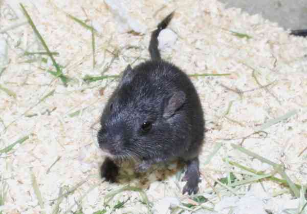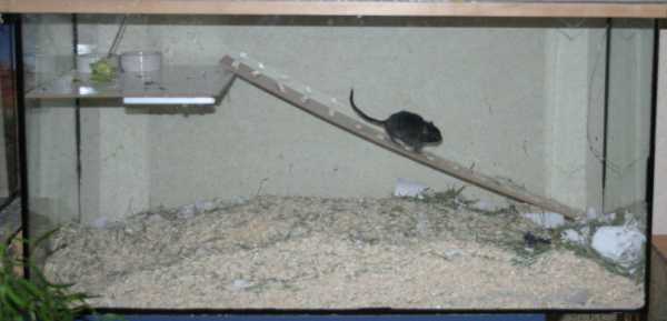 Beide Rennmäuschen lebten auf. Alpha begann gleich geschäftig zu buddeln, er war und ist immer schon ein großer Tunnelgräber gewesen. Persil interessierte sich wie üblich mehr für das Futter, um sich dann mit gefülltem Bauch in eine Ecke zurück zu ziehen. Alpha rannte geschäftig hin und her, buddelte viel und schaute hin und wieder nach dem neuen Freund. Irgendwann wurde auch Persil aktiver - aber er ist offensichtlich ein Klettermaxe und krakselte immer wieder das Gitter hoch. Das war mir zu gefährlich, denn leicht können dort kleine Rennmausfüßchen mal fest stecken und so unglaublich geschickt stellte er sich auch nicht gerade an. Also gab es spät am Abend noch eine Etage ins Aquarium mit einer langen Rampe die rauf führte. Dort oben wurde dann Futter und Wasser angeboten. Begeistert nahm Persil diese Klettermöglichkeit an, Alpha schaute nur einmal hoch und buddelte dann emsig weiter.
