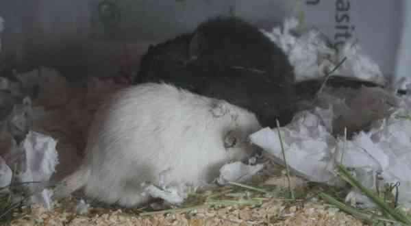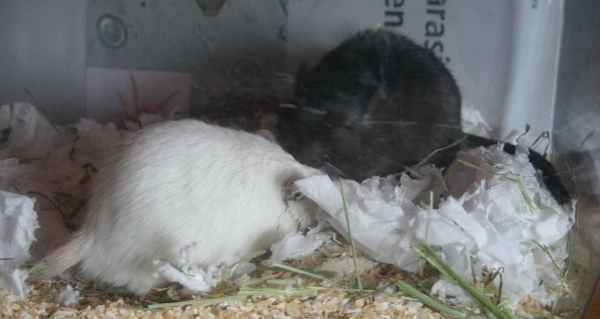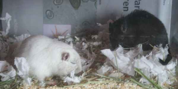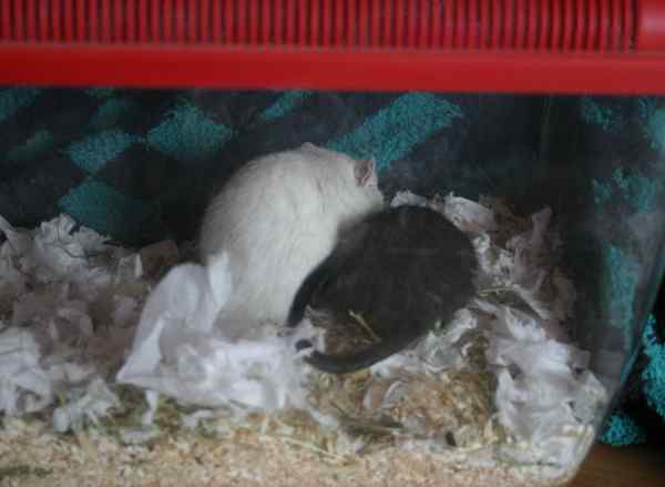 Die beiden Jungs sind total lieb zueinander. Wir haben zwei Tage lang nur immer ein wenig Streu nachgefüllt und Toilettenpapierrollen gegeben und sie beobachtet.