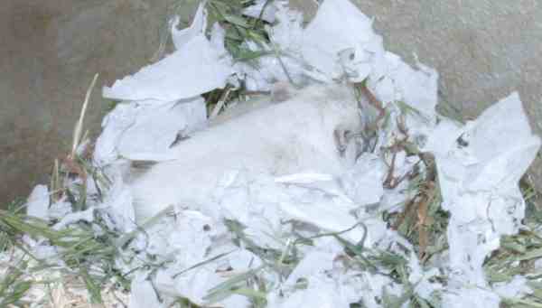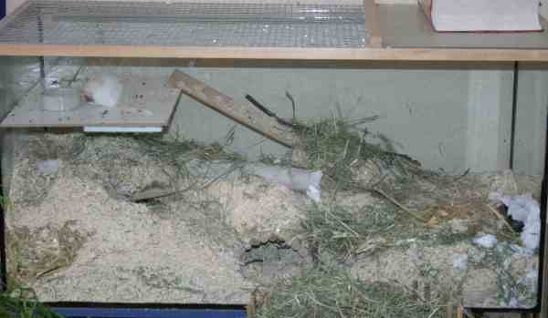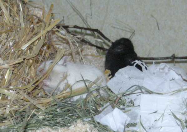 Irgendwann beschloss Persil, es sei Zeit ein Nest zu bauen, auch Alpha beschloss, es sei Zeit für ein Nest, aber beide bauten an verschiedenen Stellen, Alpha geschützt unter der Rampe, Persil vorne in der Ecke. Nachdem sich Persil von Alpha aber nicht von dem günstigen Standort unter der Rampe überzeugen ließ, ist Alpha dann eben zu Persil gezogen, schleppte sein Nistmaterial in Persils Nest und da lagen sie dann in der Nacht eng aneinander gekuschelt und ganz offensichtlich zufrieden mit sich und ihrem Tagwerk.