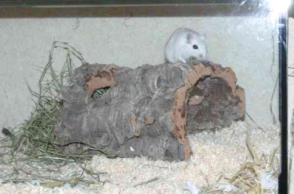 Weil beide Herren nach wie vor so lieb zueinander sind, bekamen sie als Belohnung heute eine ganz nagelneue, superschicke und nicht billige Korkröhrenhälfte. Alpha hat sie gleich geschäftig untersucht und begann unverzüglich damit, sie "aufzuräumen" ... also sie zu zernagen. Aber kann man das einer kleinen Maus übel nehmen? Wo doch diese Röhre an der falschen Stelle steht und außerdem jede Menge Streu und Heu dazu kamen?