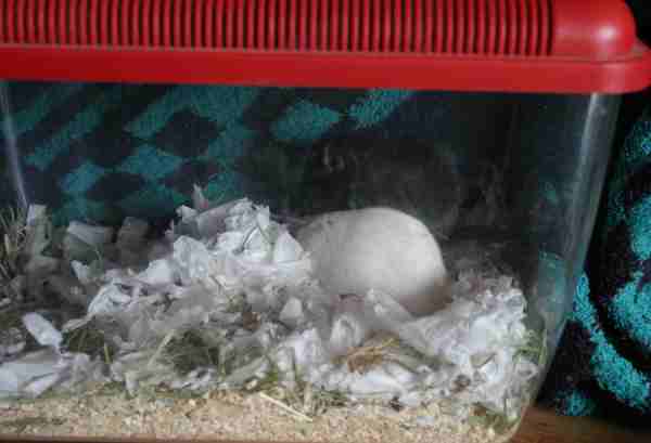 Beide Rennmäuse waren die ganze Zeit superfriedlich und zeigten keine Minute Aggressionen. Ganz im Gegenteil, immer wenn sie sich am Gitter trafen, hat Alpha sein Köpfchen geneigt und wollte geputzt werden und Persil schnüffelte und zwar sehr lieb. Eben saßen sie wieder am Gitter, Alpha wirkte sichtlich frustriert, weil er nicht geputzt werden konnte und auch Persil zeigte deutlich, dass er diesen Zustand nicht erfreulich findet. Also habe ich kurzerhand aus jedem Nest Nistmaterial und Streu genommen, zusammen mit einem Haufen Trockenfutter flog es in die Transportbox und die kleinen Rennmäuse "flogen" hinterher.