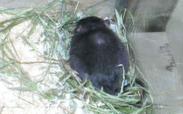 Beide Rennmäuse verbringen den größten Teil ihrer Zeit damit zu schlafen. Sie langweilen sich sichtlich, aber stereotype Verhaltensweisen sind trotzdem noch nicht zu erkennen. Es wird kaum am Gitter genagt oder in Ecken gebuddelt. Alpha schaut manchmal intensiv zur anderen Gehegeseite... es wirkt fast so, als würde er Persy beobachten. Persy ist hingegen eigentlich nur am Essen interessiert und will gern aus dem Gehege raus, er kommt einem entgegen geklettert, sobald das Gehege geöffnet wird. Nach dem Umsetzen nahmen beide das Nest des jeweils anderen an.