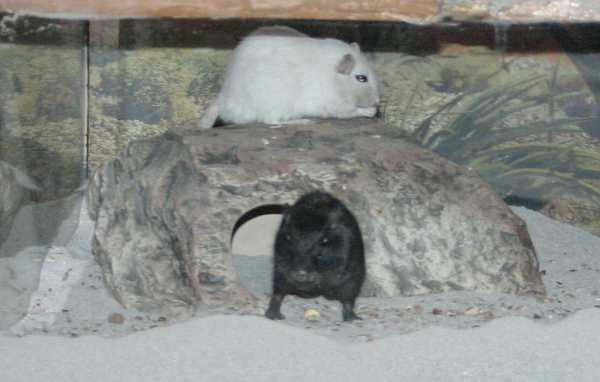 Gestern Abend langweilten sich die Racker aber doch so sehr, dass ich es für dringend nötig befand, ihnen mehr Platz zu gönnen. Also habe ich kurzerhand das Sandgehege wieder angeschlossen. Ich habe dieses allerdings erstmal nur sehr spartanisch eingerichtet: Labyrinth, Laufrad, ein wenig Kork und das Lieblingshaus von Persil sowie 15 l Chinchillasand bilden bisher die ganze Einrichtung. Eigentlich wollte ich ein Treppenhaus von einem Gehege ins andere bauen, weil ich ein wenig in Sorge war, ob sie sich nicht doch in den Röhren streiten (es passt nur eine Maus durch so eine Röhre). Aber dann sah ich vorher, wie sich beide an der Glasscheibe in einem selbstgebauten Tunnel begegneten und da hat Persil sofort den Rückzug angetreten, als ihm Alpha entgegenkam. Ich denke, beide können sich gut einigen und die Aquariumverbindungsröhren sind ja auch nicht sehr lang. Alpha stürzte sich sofort rüber in "sein" Sandgehege und war ganz offensichtlich gut drauf, er sandelte, sprang umher und ist dann immer wieder zurück gelaufen um Persil anzustupsen. Aber der kleine Stoffel saß am Futternapf und lies sich nicht stören. Dann wollte er doch wissen, wo Alpha immer hinging, hat aber die Sache mit den Röhren nicht ganz geblickt. Ich habe ihm dann mit Mehlwürmern nachgeholfen... er fand das Sandgehege superaufregend. Aber er fand nicht mehr zurück. Fast dankbar war er, als ich ihn dann wieder zurück gesetzt habe. Ergo: wie überlegen nun, wie wir ihm den Übergang von einem Aqua ins nächste erleichtern könnten. Streit gab es übrigens auch da wieder gar nicht, ganz im Gegenteil, als Persil langsam Angst bekam in ungewohnter Umgebung, hat Alpha ihn ganz offensichtlich tröstend geputzt.