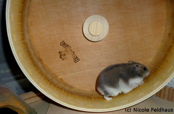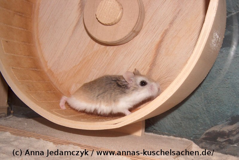 Einige Modelle lassen sich sogar in der Höhe verstellen und können so auch bei hoher Einstreu gut aufgestellt werden. Diese Räder haben eine durchgehende, gewachste Lauffläche oder eine Korklauffläche und sind nicht chemisch behandelt. Sie laufen durch ein hochwertiges Kugellager ruhig und sind an der geschlossenen Seite aufgehängt. Nicht geeignet sind fast alle anderen, meist günstigeren, Holzlaufräder aus dem Handel. Die dort eingeklebten Laufstege sind für Hamsterfüße zu groß, haben einen zu hohen Abstand und damit machen sie ein gleichmäßiges Laufen unmöglich . Auch wenn es auf den ersten Blick so aussieht, als könnten die Tiere gut laufen, die Auswertung von Filmaterial hat deutlich gezeigt, dass die Tiere in solchen Rädern nicht so gut und so gleichmäßig laufen können, wie in den Rädern mit Rillenstruktur. Es kommt in den Rädern dazu, dass die Tiere häufiger stolpern und sich verletzen. Außerdem ist das Holz sehr rau und es kam und kommt immer wieder zu blutigen Spuren in den Rädern, die darauf hindeuten, dass die Tiere sich die Fußsohlen wund laufen und sogar durchlaufen. Sie können solche billigen Räder verwenden, wenn Sie die Sprossen entfernen und eine dünne Korkplatte als Lauffläche einkleben.